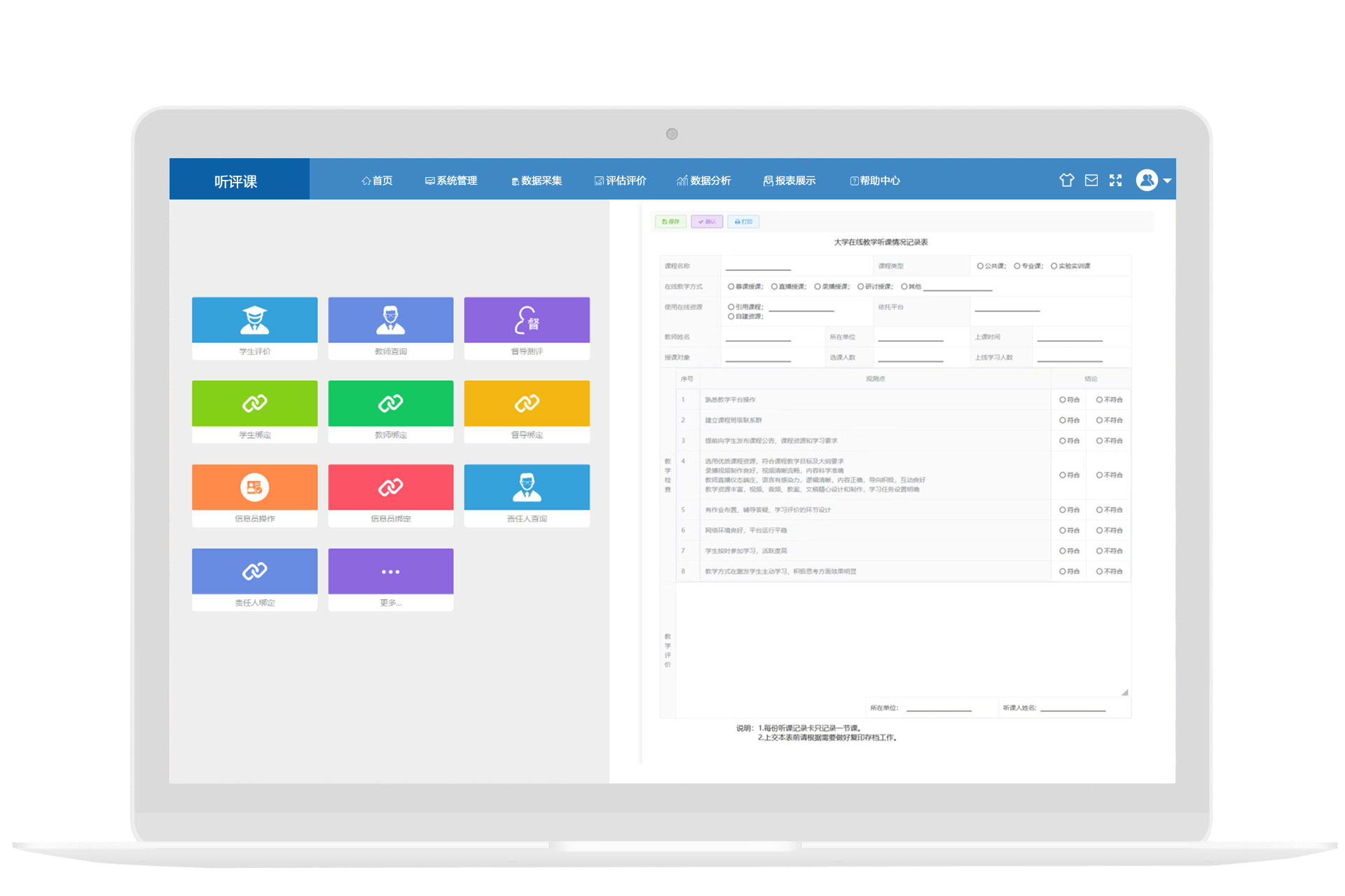 听评课指标管理,支持随机听课、专题听课和申请听课多种形式落实校领导及中层干部,督导,同行的听课以及学生评教制度,及时了解听评课评教工作进展情况及教师的教学情况 。