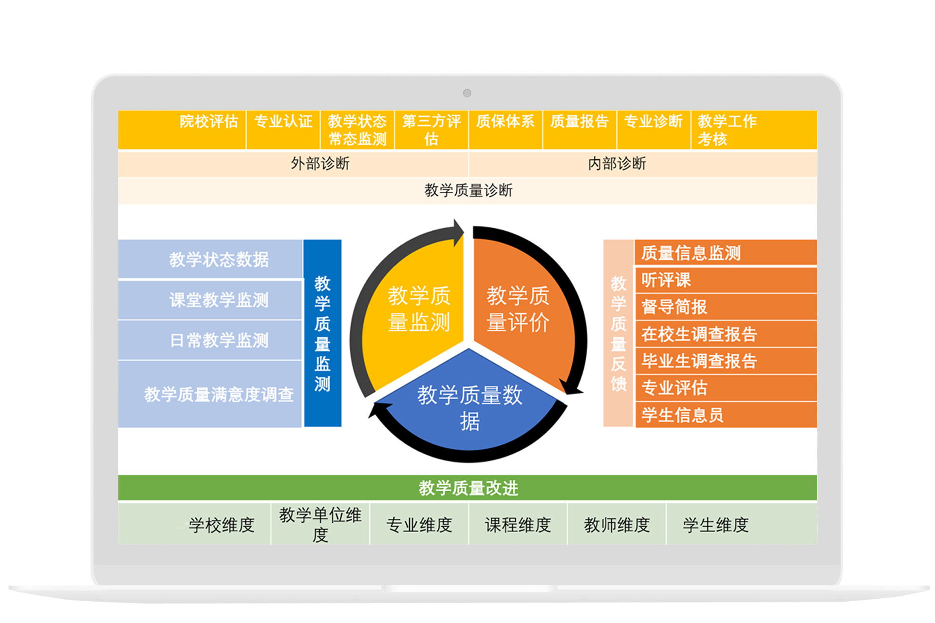 在教育教学数据仓库中,我们可实现统筹教学基本状态数据、教育事业综合统计调查表采集、分析,形成学校教育教学数据的动态监测与治理机制。还可以在多维评估评价中面向院校(审核评估、合格评估)、教学院与职能部处、学科专业、课程、教师、学生的360度教育质量数据常态化监测。